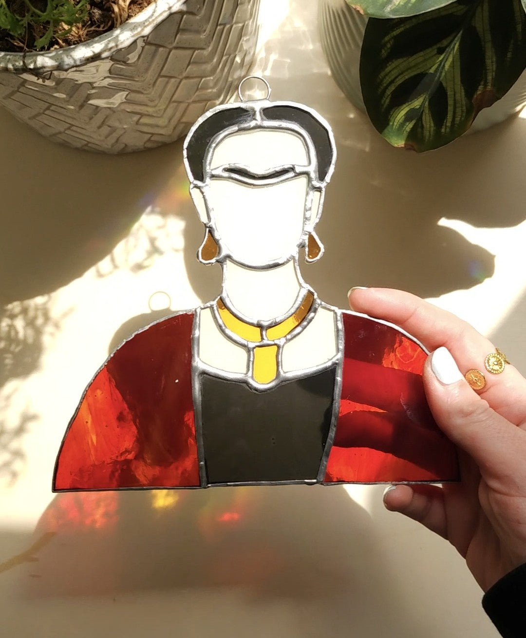 Icône féminine, artiste engagée et muse éternelle, Frida Kahlo prend vie dans cette interprétation moderne et colorée. La puissance de son regard, ses bijoux emblématiques et sa coiffure reconnaissable entre toutes sont ici évoqués avec justesse grâce à un travail minutieux du verre coloré. Les tons rouges profonds et dorés évoquent sa passion, son feu intérieur et son univers unique.